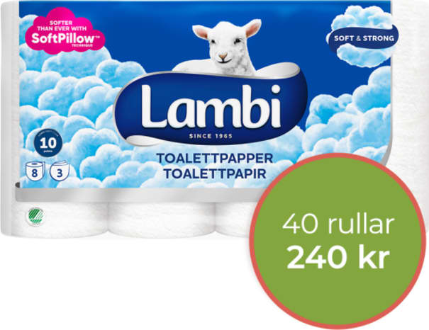 Mjukt & skönt 3-lagers toalettpapper från Lambi. Rekommenderas av Astma- och allergiförbundet. Varje bal består av 5 förpackningar à 8 rullar.